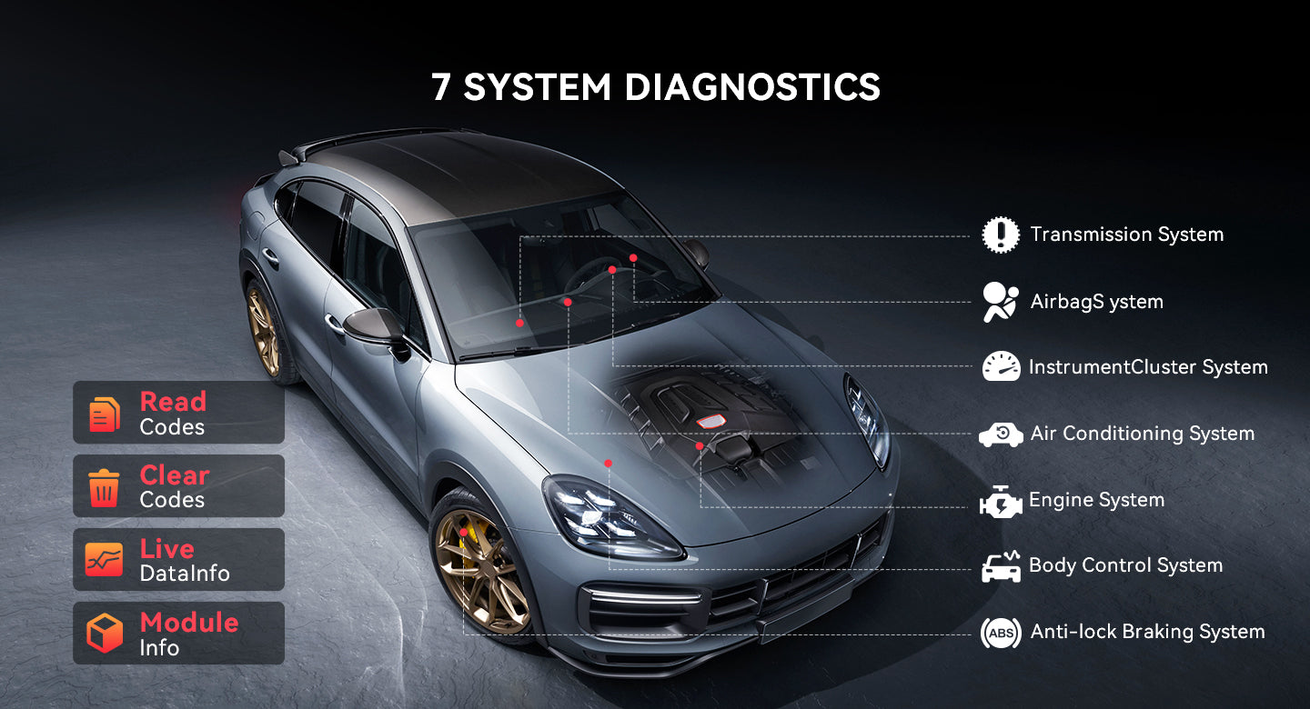 ThinkScan Plus S7 supports 7 systems (ABS/SRS/ECM/TCM/BCM/AC/IC) + choose 5 optional resets from 28 reset lifetime free use and update for all cars.